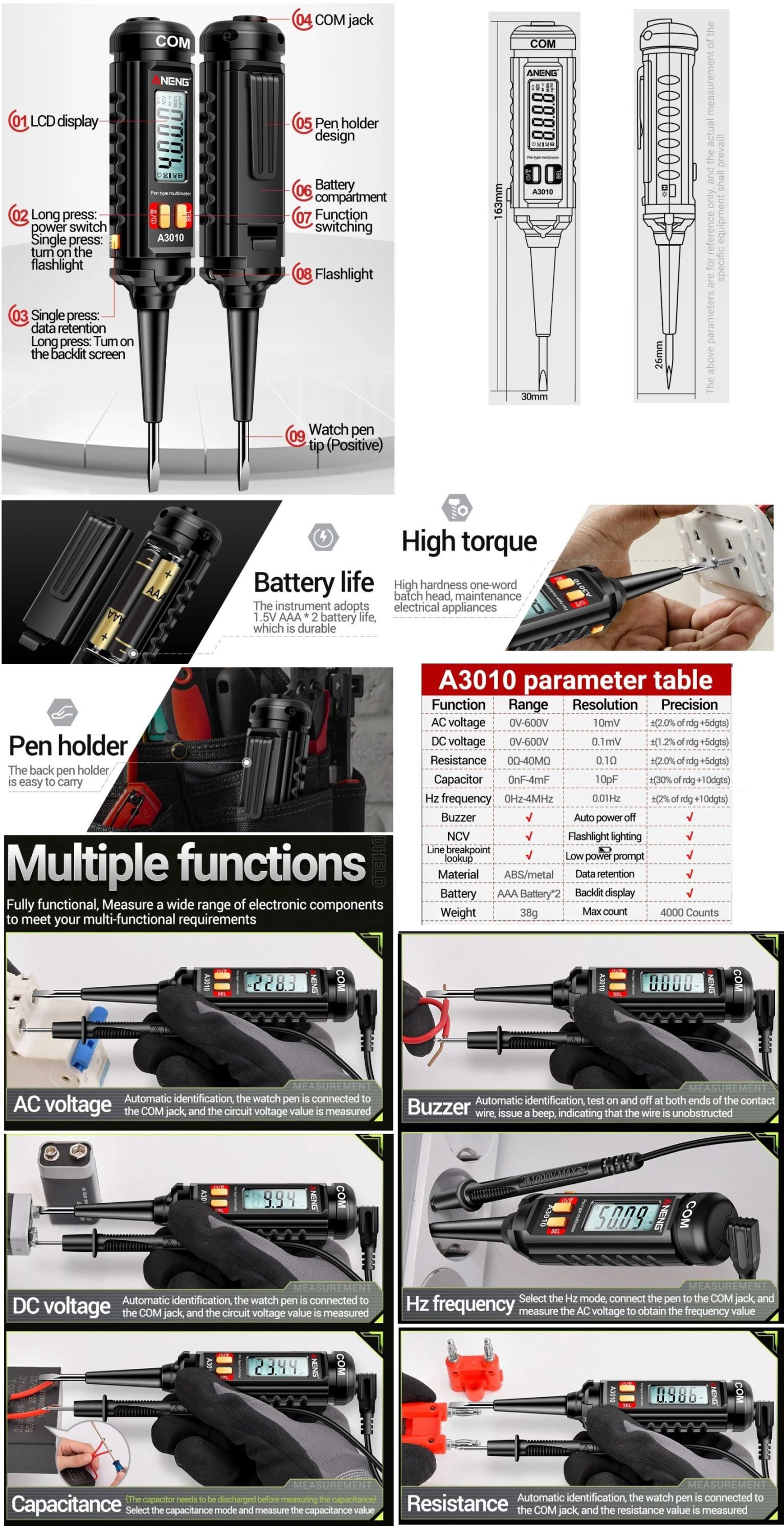 Este medidor digital tipo bolígrafo es un pequeño instrumento digital de escaneo automático RMS verdadero de 3 3/4 bits. De acuerdo con la diferencia entre voltaje y resistencia, no necesita seleccionar la función, debido a su medición de identificación automática.
