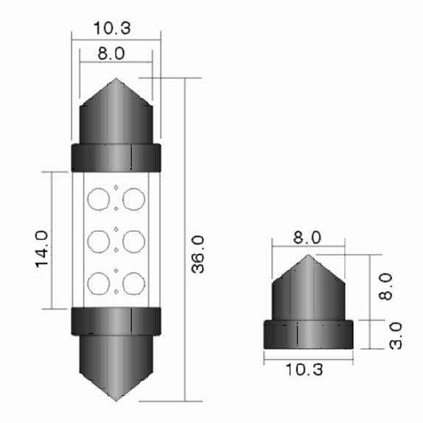 Bombillas para Vehículos con casquillos Festoon y 6 LED encapsulados de 3mm y 36mm de largo, Colores: Azul, Rojo, y Verde.