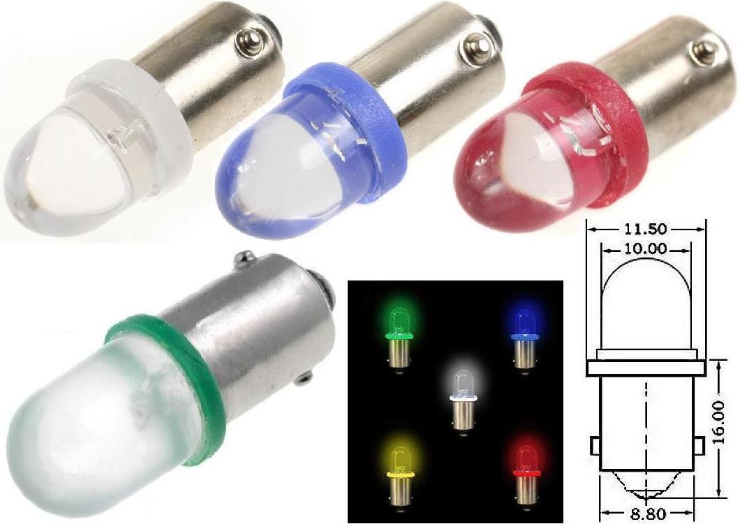 Bombillas de 1 Led encapsulado Cabeza redonda de 10mm y 12v para casquillos de porta Lamparas de bayoneta tipo BA9S.