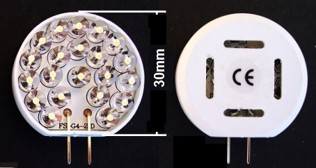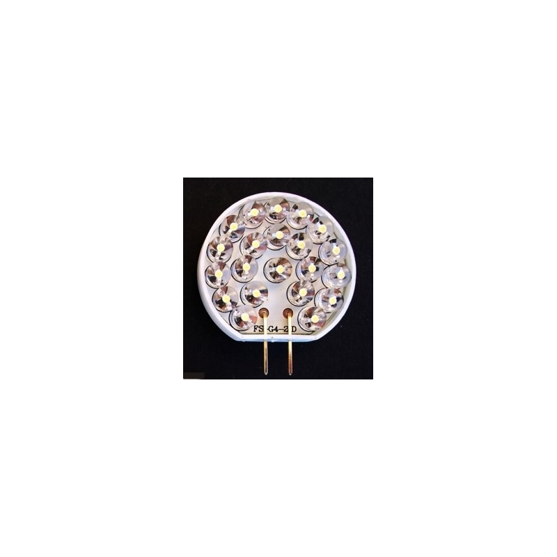 Bombillas de 21 Led Bombin encapsulado con Circuito PCB Redondo de 30mm y 2 patas de Contacto para Casquillo G4, Colores: Blanco frio.