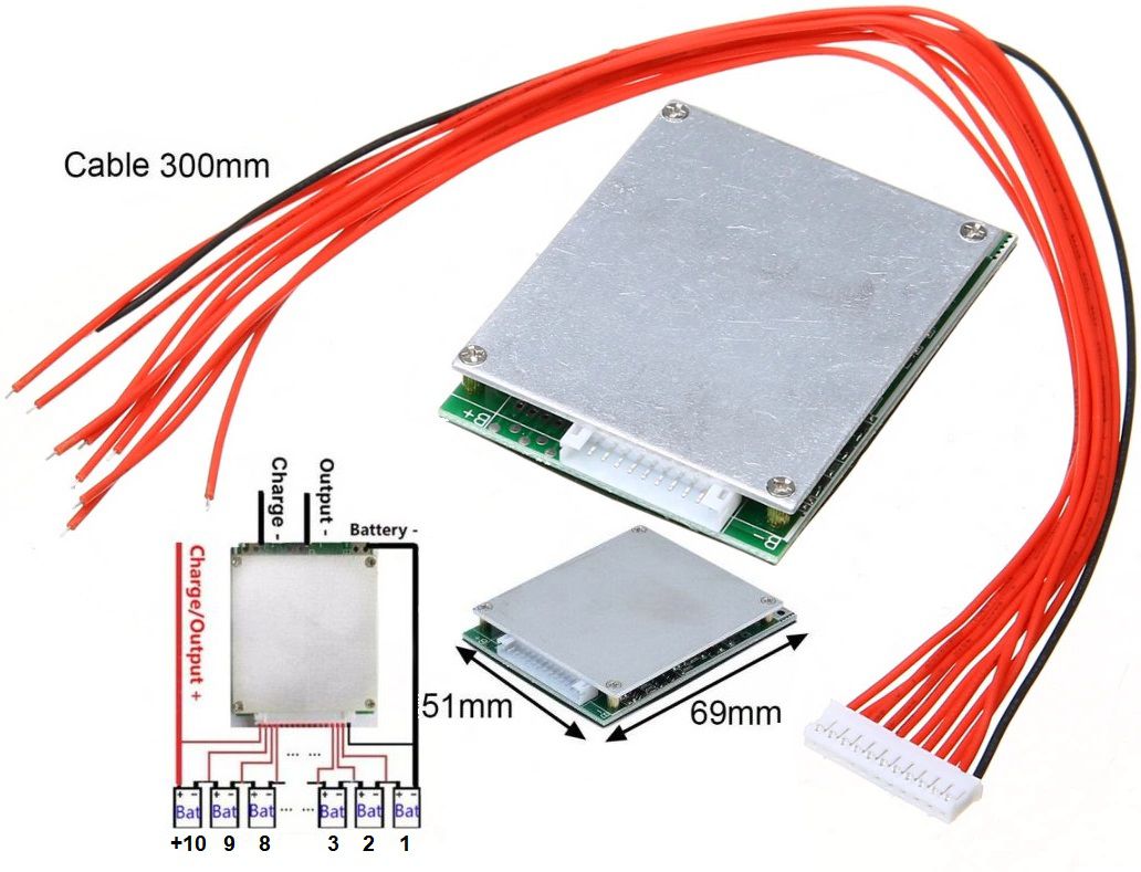 Circuito PCM de proteccíon para 10 Baterías de Litio 10S 36v 30A