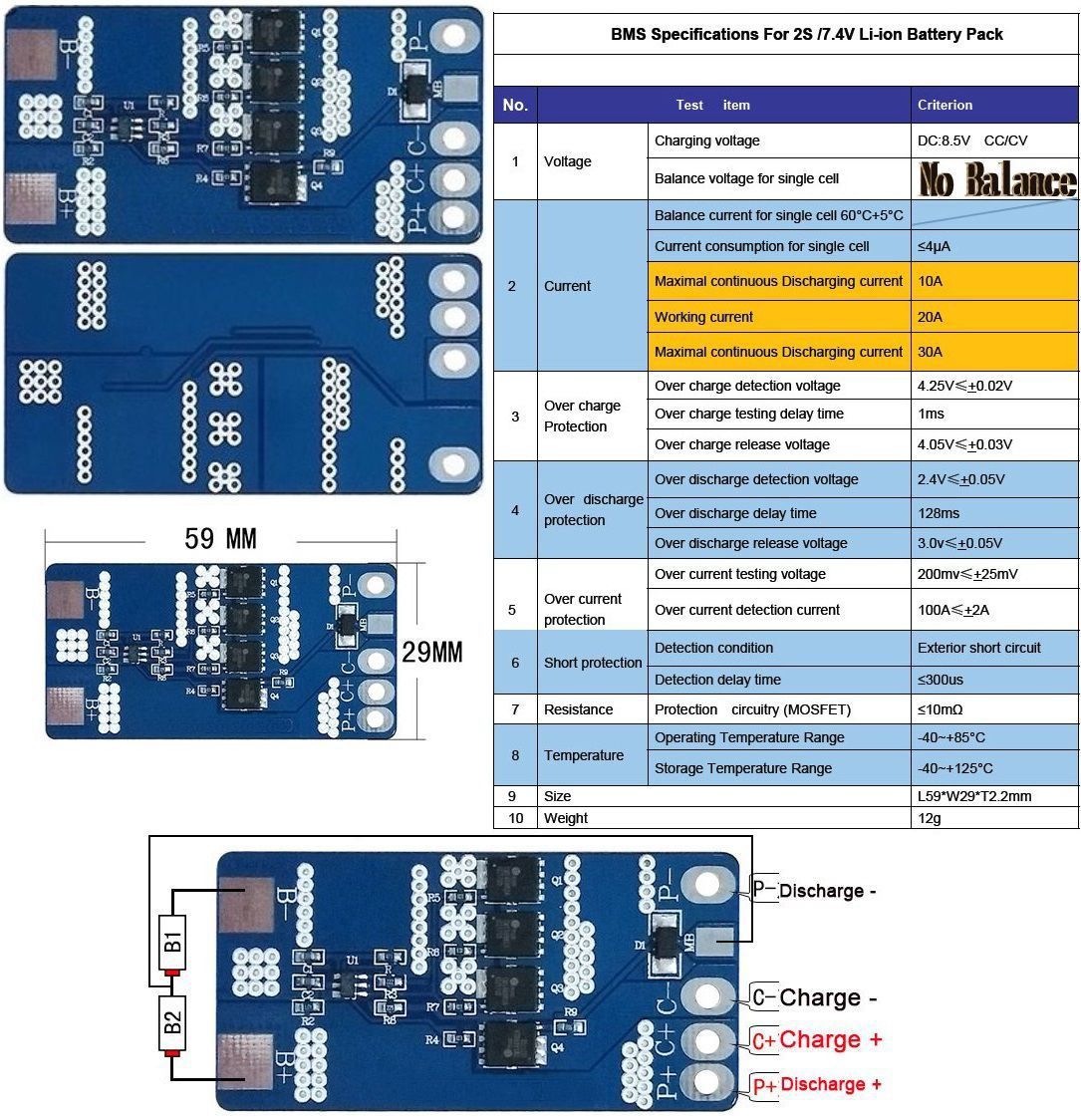 PCM 2S para Baterías de Litio, Litio 7.4v 10-20A.