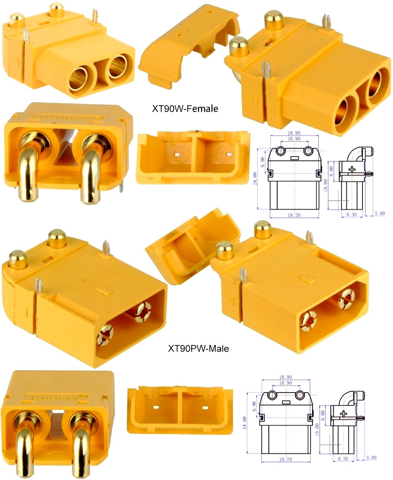 La familia XT90 está diseñado para aceptar calibres de cable AWG 8, por lo tanto, manejar altas corrientes típicamente 90 A continuo.