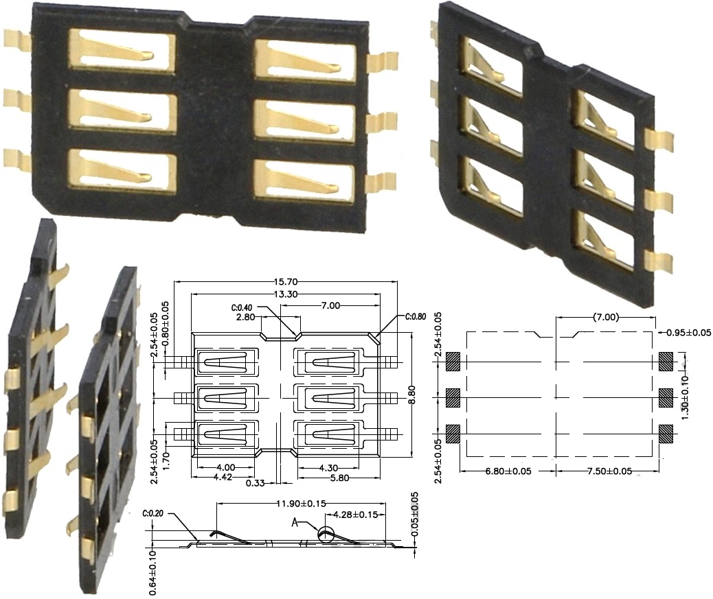 Conector SIM 115E 6 contactos para soldaduras en circuitos electronicos de dispositivos de memoria.