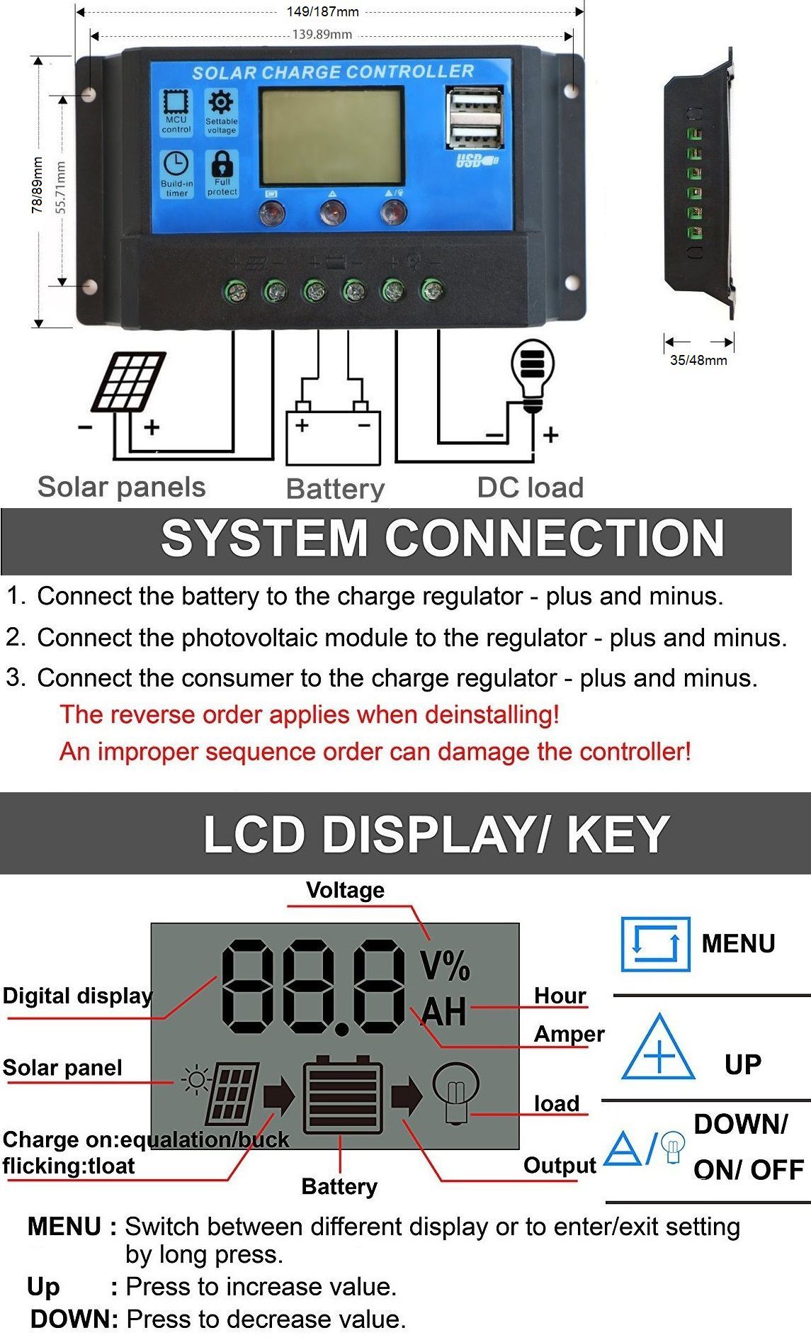 | Entrada Solar máxima | 48V (para batería de 24V) 24V (para batería de 12V). | |||||