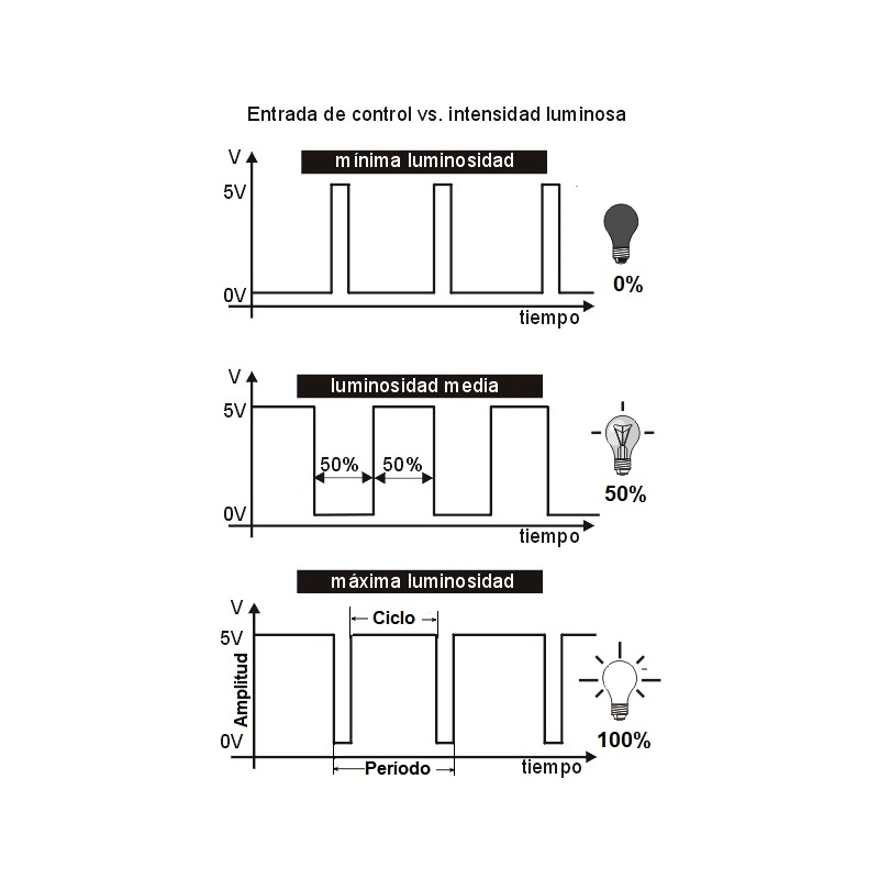 Fíjarse que el ancho de la onda, su altura, siempre es la misma. De 0 a 5 Voltios. Lo único que varía es el tiempo que está en ON/OFF.