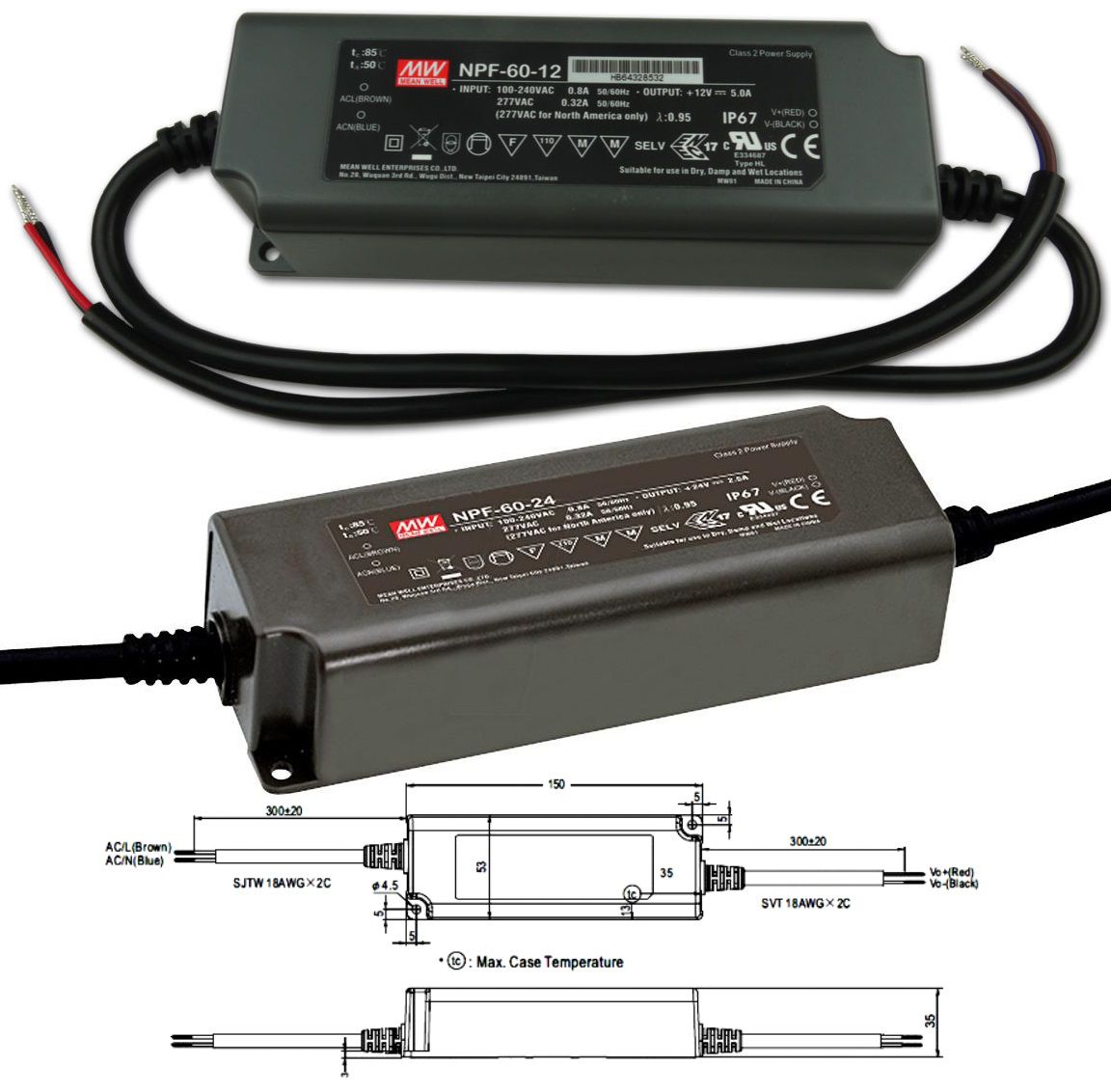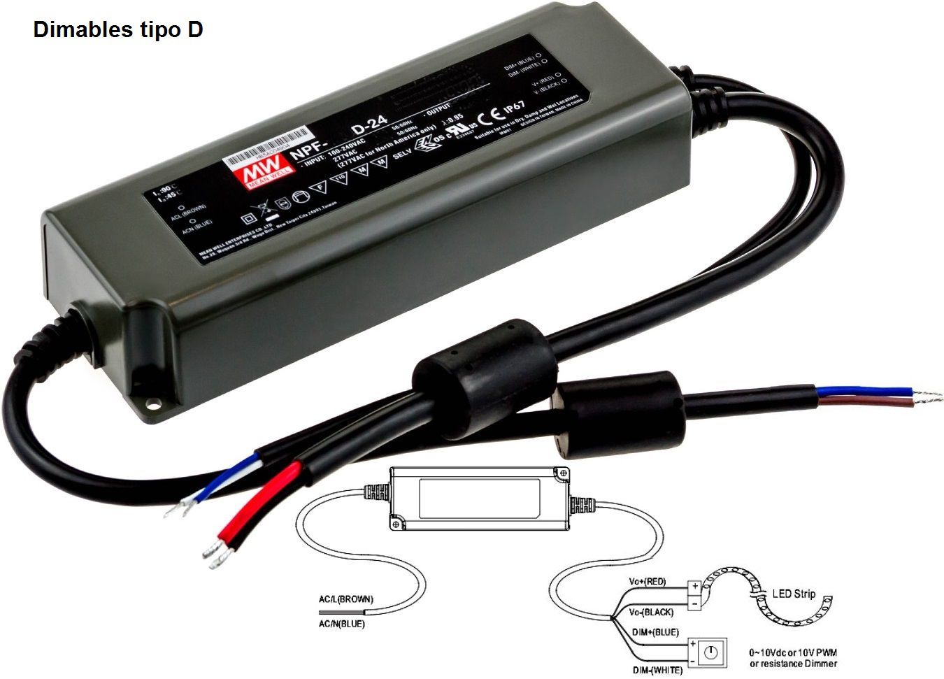 Fuentes Estancas MeanWell de Alimentación para Led, Modelos: NPF-60-24, NPF-60-12, NPF-60-48, y Dimmer: NPF-60D-48, NPF-60D-12, NPF-60D-24