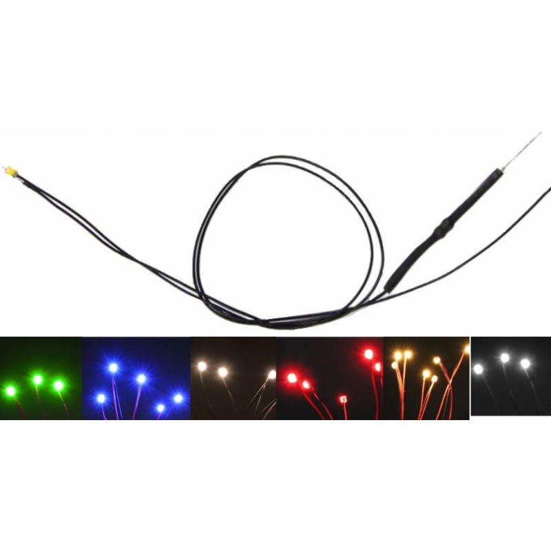 Led cableados especiales para montajes en cuadros, modelismo, trenes en miniatura, cartelería, miniaturas, decoraciones de interior. Incorpora la resistencia adecuada a cada voltaje y corriente del Led
