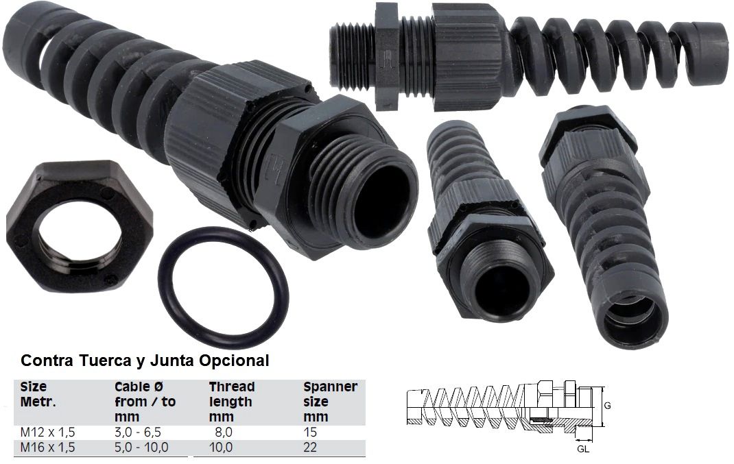 Pasacables/Pasamuros de Cola Negros para Cables o Mangueras, tipo Métrica