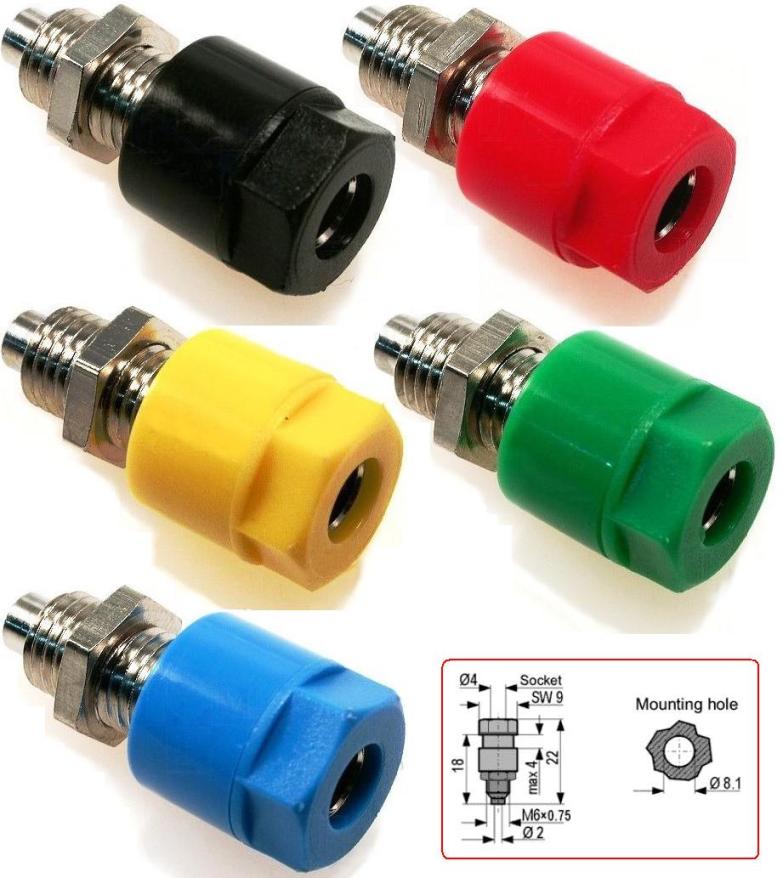 Conectores de Audio, Bananas Hembras, Chasis 4 mm, Potencia 36A.