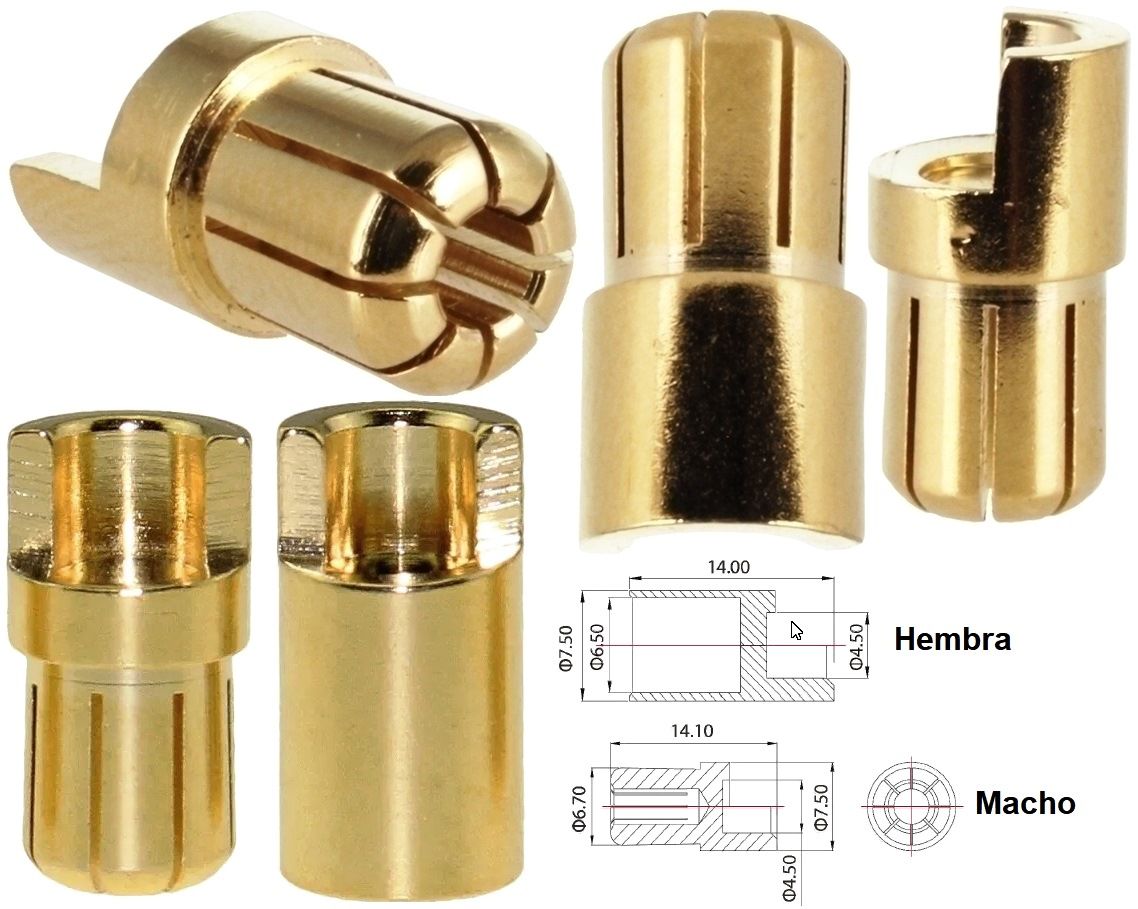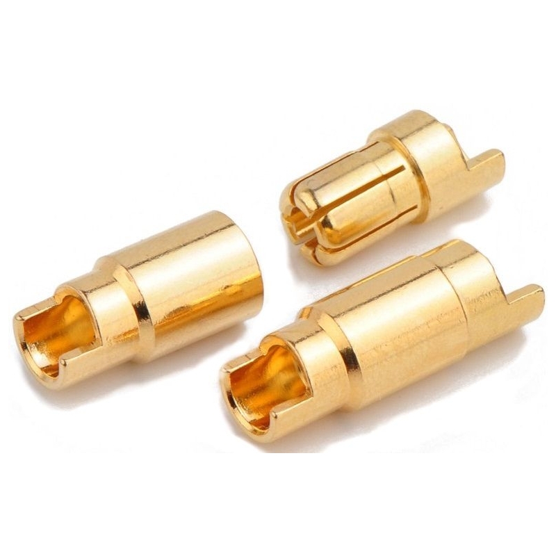 Estos conectores son bananas de 6, 6.5 o 8mm chapados en oro, es ideal para aplicaciones de alta corriente, hasta de 80A constante según modelos. Se usan básicamente en baterías LiPo o Pack de Litio de alto drenaje.
