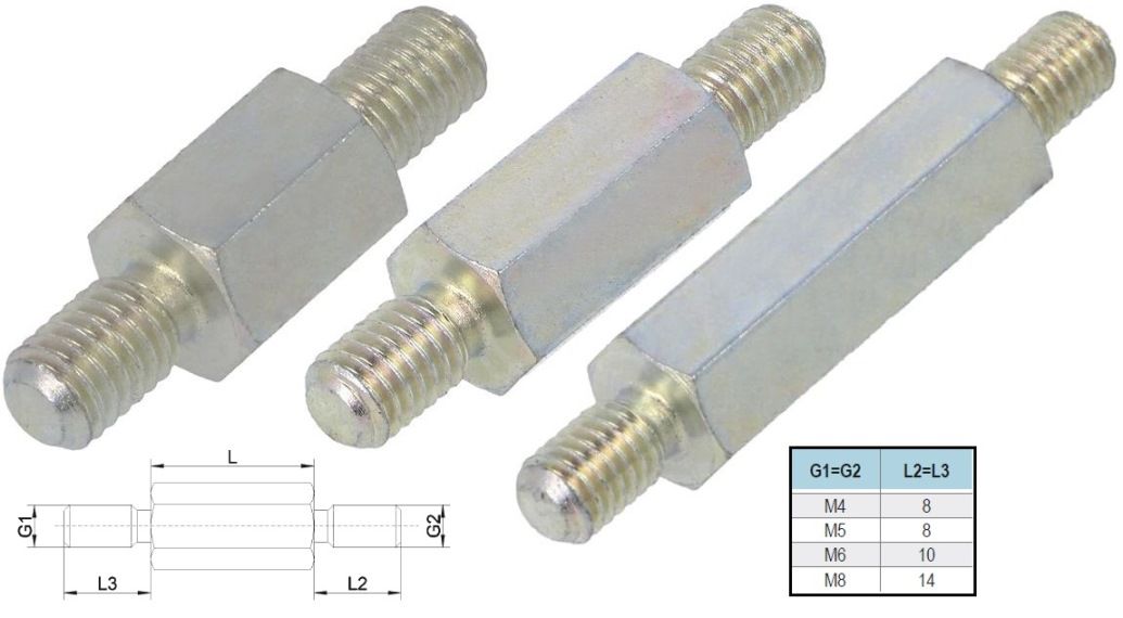 Separadores hexagonales con rosca de tornillo M4 en ambos lados.