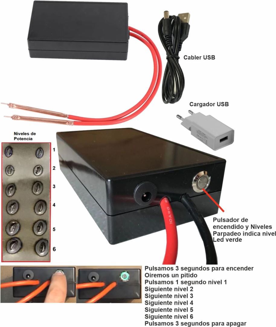 3. Para cambiar la configuración de potencia: presione brevemente el botón hasta que se escuche un pitido y vea el parpadeo del LED correspondiente para la configuración. (1 parpadeo nivel 1, 2 parpadeos nivel 2 y así sucesivamente)