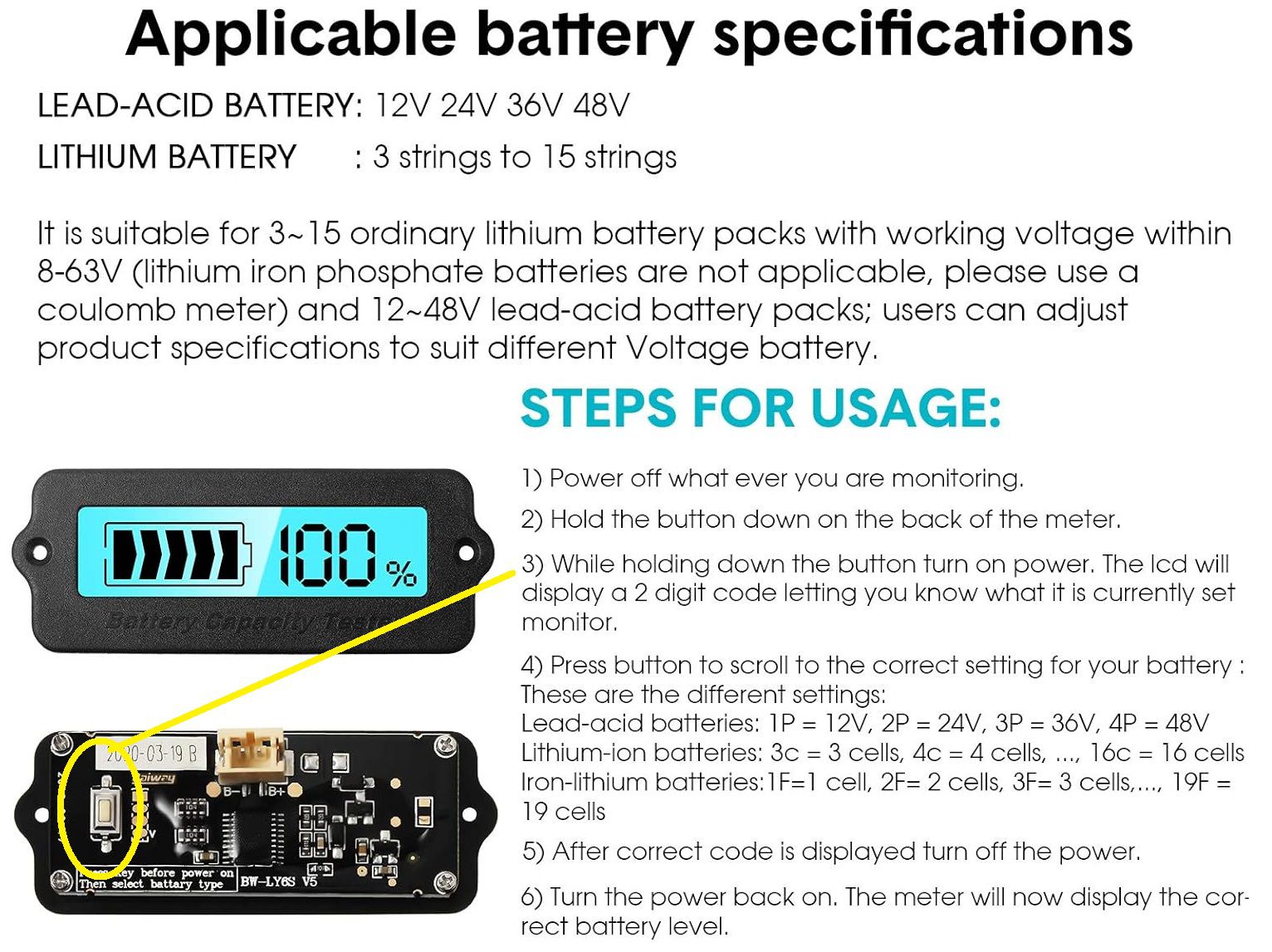 Indicador de capacidad de Batería y Pack de Litio de 8V-63V y Plomo