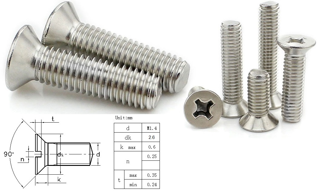 Micro Tornillos Acero A2 M1.4 Din965 Cabeza plana de cruz