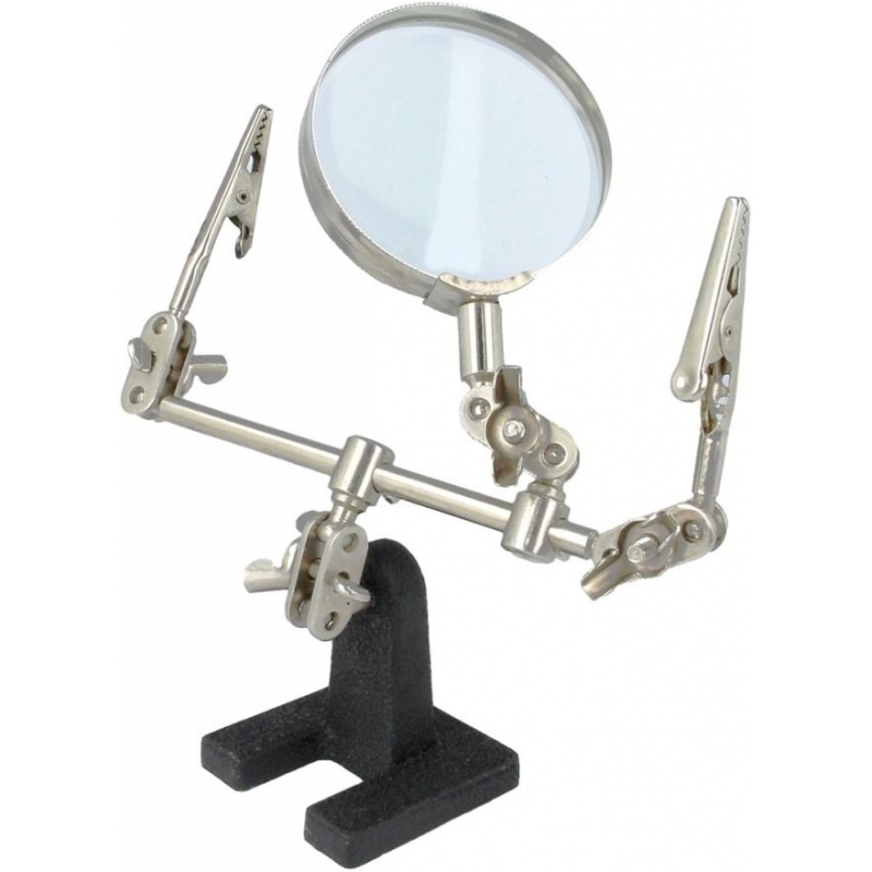 Soporte con dos Pinzas, Lupa, Giratoria, Base metal para montajes de componentes electrónicos en circuitos PCB y placas